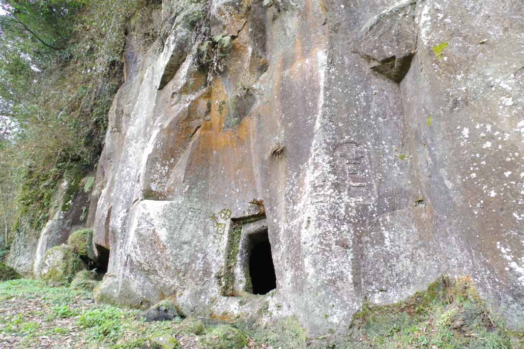 九州を代表する古墳文化の一つである装飾古墳。その南限に位置し、1号墓の入り口周囲には、浮き彫りにより、靭や盾、剣といった武具が表現されており、その後赤色の顔料によって模様が表現されている。球磨川と川辺川の合流地点を見下ろすように、阿蘇溶結凝灰岩の崖面に彫られる。県指定文化財。