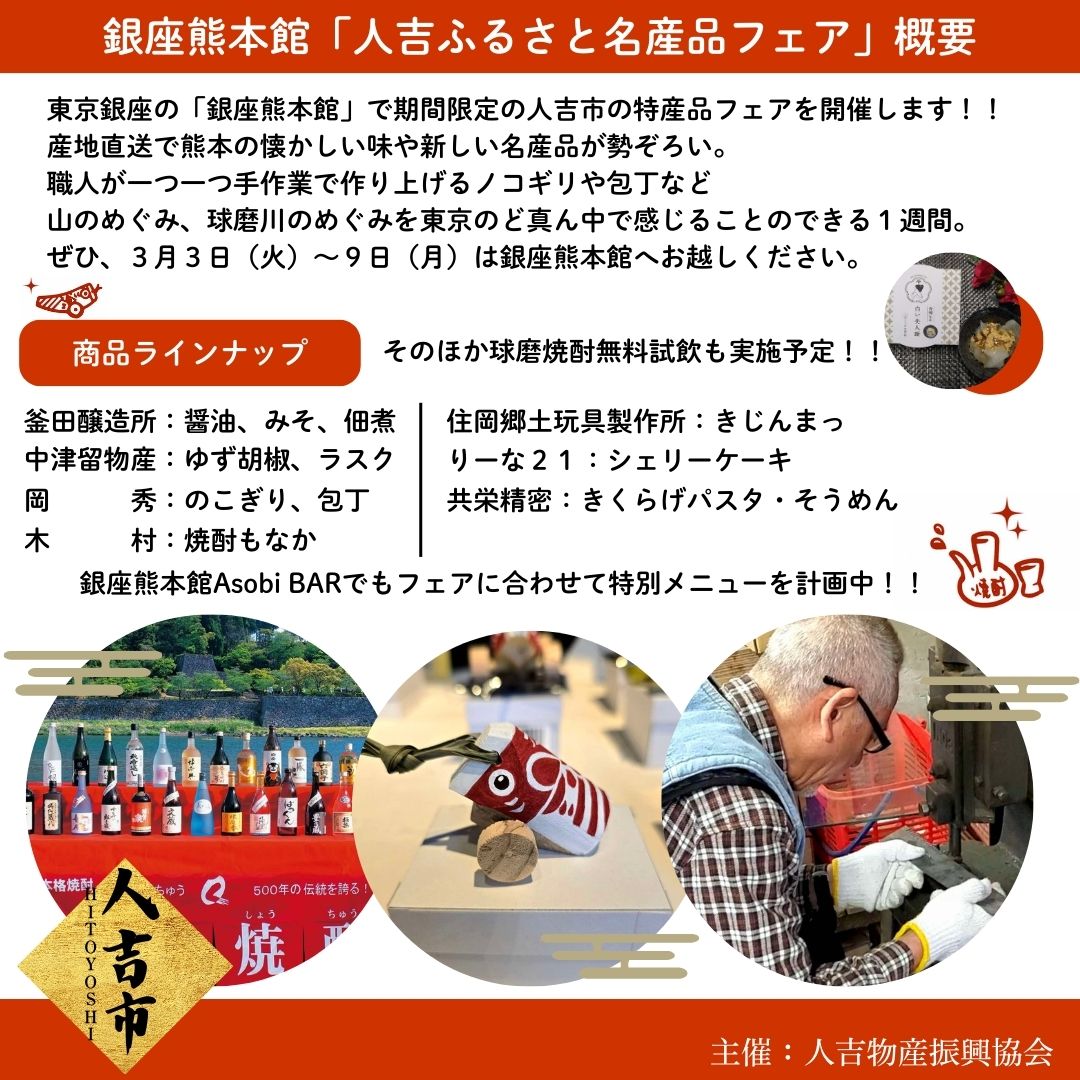 東京銀座の「銀座熊本館」で、期間限定の人吉市の特産品フェアが開催されます。